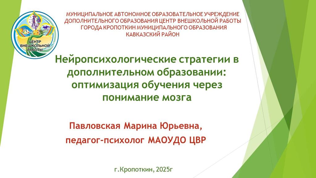 «Нейропсихологические стратегии в дополнительном образовании: оптимизация обучения через понимание мозга» - Павловская Марина Юрьевна, педагог-психолог МАОУДО ЦВР г.Кропоткин МО Кавказский район