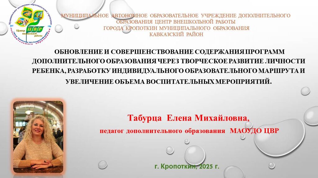 «Обновление и совершенствование содержания программ дополнительного образования через творческое развитие личности ребёнка, разработку индивидуального образовательного маршрута и увеличение объёма воспитательных мероприятий» - Табурца Елена Михайловна, педагог дополнительного образования МАОУДО ЦВР г.Кропоткин МО Кавказский район
