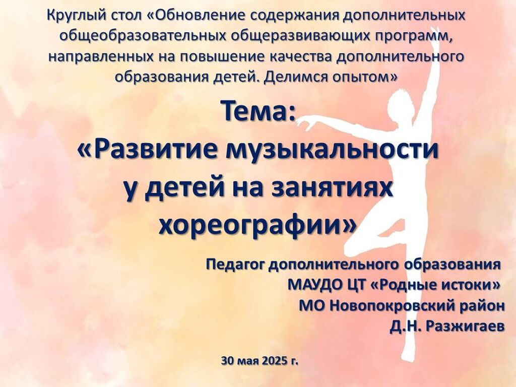 «Развитие музыкальности у детей на занятиях хореографии» - Разжигаев Денис Николаевич, педагог дополнительного образования МАУ ДО Центр творчества «Родные истоки» станицы Новопокровской МО Новопокровский район