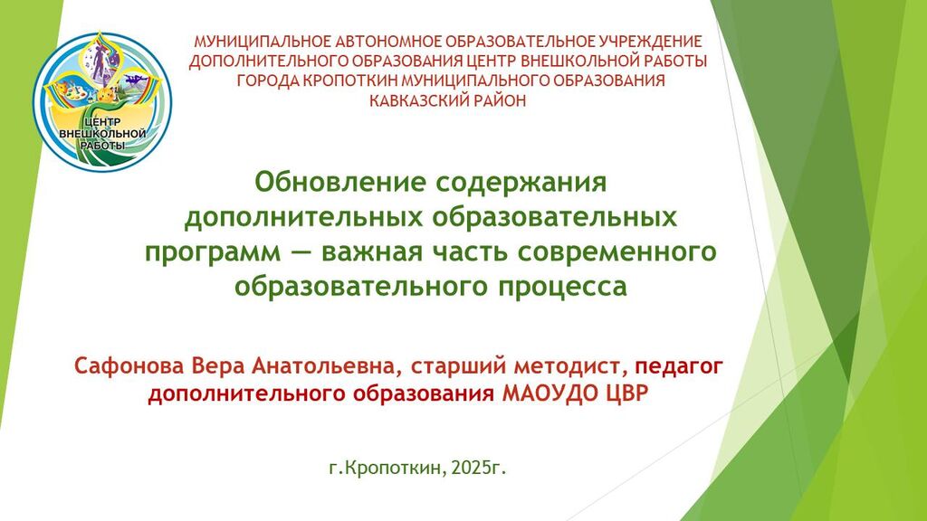 «Обновление содержания дополнительных образовательных программ — важная часть современного образовательного процесса» - Сафонова Вера Анатольевна, старший методист МАОУДО ЦВР г.Кропоткин МО Кавказский район