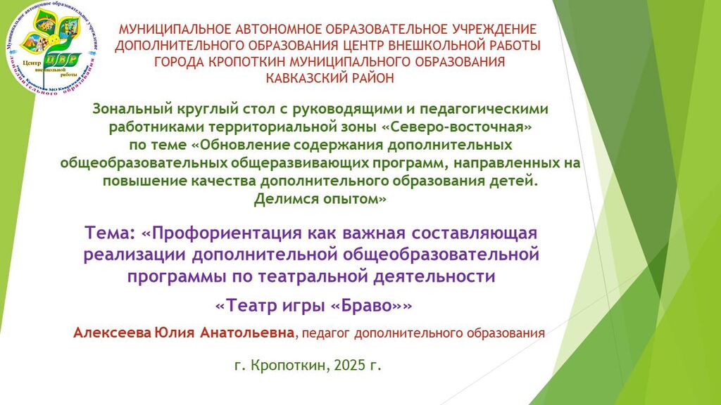 «Профориентация как важная составляющая реализации дополнительной общеобразовательной программы по театральной деятельности «Театр игры «Браво»» - Алексеева Юлия Анатольевна, педагог дополнительного образования МАОУДО ЦВР г.Кропоткин МО Кавказский район - Сценарий зашиты