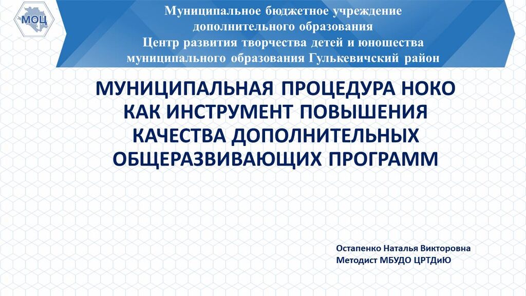 «Муниципальная процедура НОКО как инструмент повышения качества дополнительных общеразвивающих программ» - Остапенко Наталья Викторовна, методист МБУДО ЦРТДиЮ МО Гулькевичский район