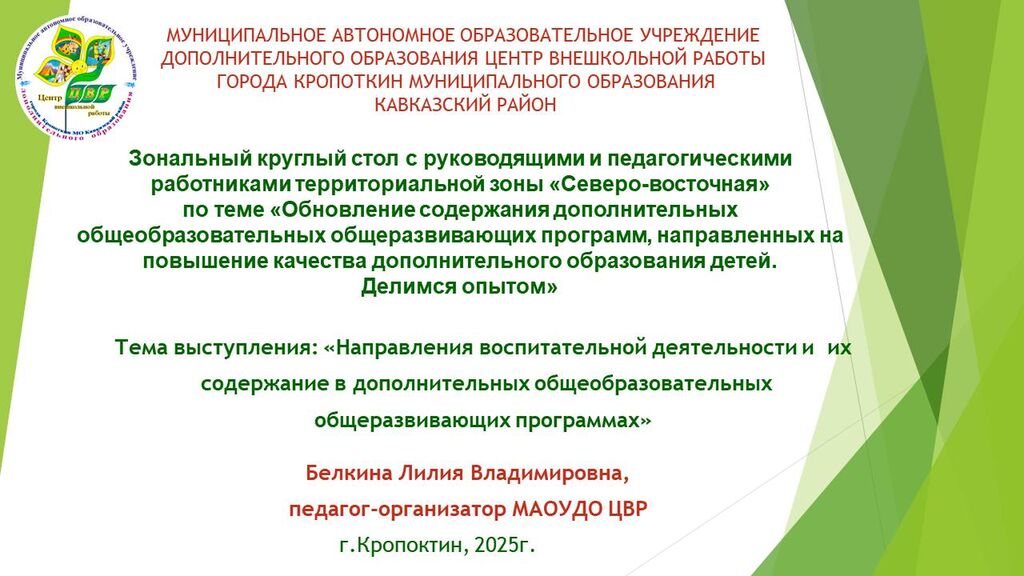 «Направления воспитательной деятельности и их содержание в дополнительных общеобразовательных общеразвивающих программах» - Белкина Лилия Владимировна, педагог-организатор МАОУДО ЦВР г.Кропоткин МО Кавказский район