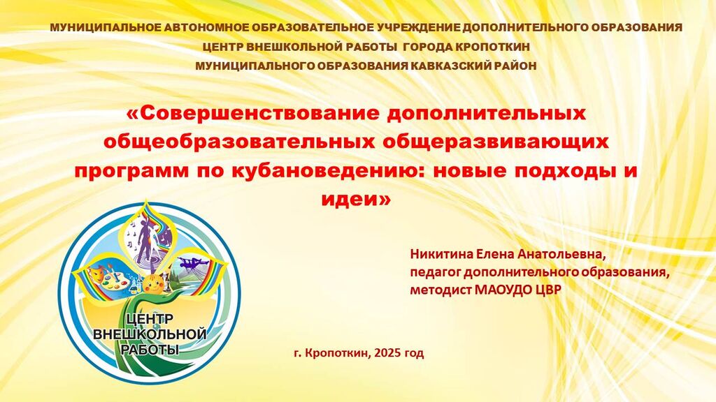 «Совершенствование ДО программ по кубановедению: новые подходы и идеи» - Никитина Елена Анатольевна, методист МАОУДО ЦВР г.Кропоткин МО Кавказский район