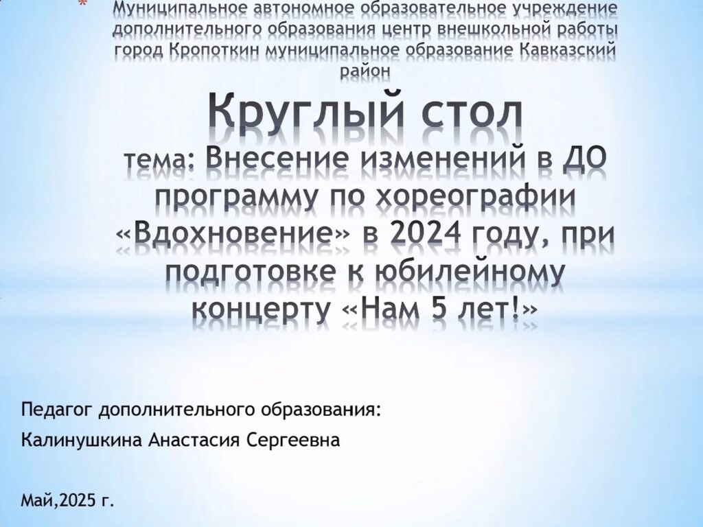 «Внесение изменений в ДО программу по хореографии «Вдохновение» в 2024 году, при подготовке к юбилейному концерту «Нам 5 лет!»» - Калинушкина Анастасия Сергеевна, педагог дополнительного образования МАОУДО ЦВР г.Кропоткин МО Кавказский район